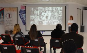 Olesya Drashkaba, who was on the island as a guest of the American Embassy, met with the students at the event organized in cooperation with the Near East University Near East Institute and the Faculty of Economics and Administrative Sciences. Drashkaba gave information about the international project and mobile exhibition titled “Womanly Face of War”, which is carried out in cooperation with the Ukrainian artists platform “Sunseed Art” and “Resilient Ukraine” organizations.