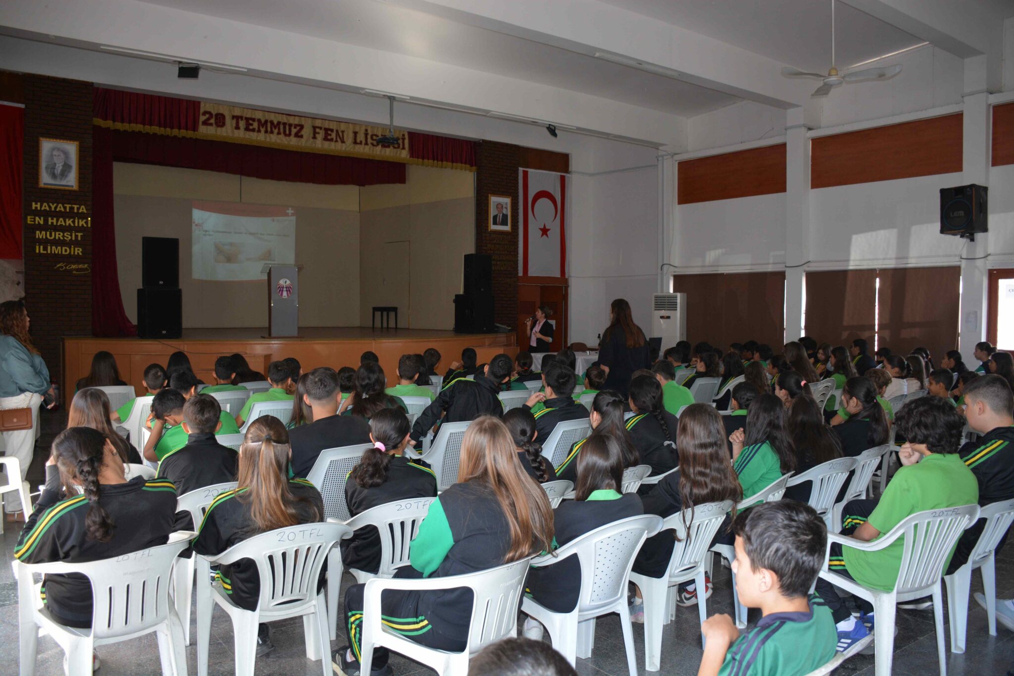 As part of Breast Cancer Awareness Month, Near East University Hospital, in collaboration with the Cancer Patients Aid Association, has launched “Breast Cancer Awareness Education Seminars” in public schools to highlight the importance of early detection. The first seminar was held at 20 Temmuz Science High School, where students and teachers learned about breast cancer symptoms, early diagnosis methods, and the importance of regular check-ups.